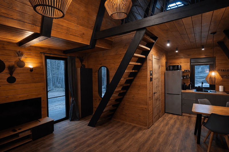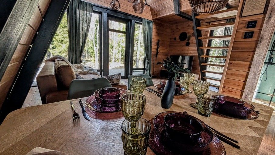В домике есть всё, чтобы отдых был лёгким и по-настоящему комфортным: удобная двуспальная кровать, мягкий диван-кровать, бельё, полотенца, тёплые полы, чайник, кофемашина, плита, чай и кофе, комплект посуды, мангал и всё необходимое для барбекю. В гостиной — небольшая, но очень атмосферная зона отдыха, где приятно смотреть фильмы или просто сидеть, укрывшись пледом. На террасе — столовая зона под открытым небом, идеально подходящая для утреннего кофе или вечернего какао.