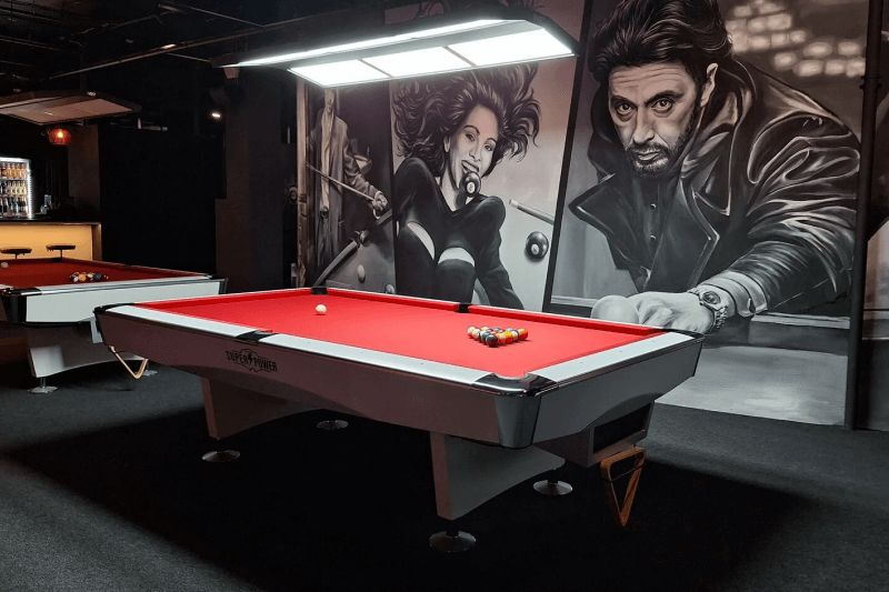Американский пул, Китайский пул, Русская пирамида, VIP Русская пирамида, а также большой бар с напитками (безалкогольные, крепкие напитки, коктейли), барными закусками и теплой пиццей.