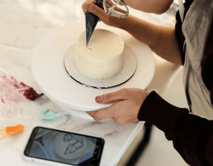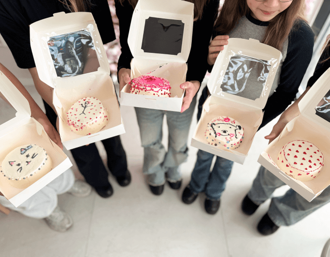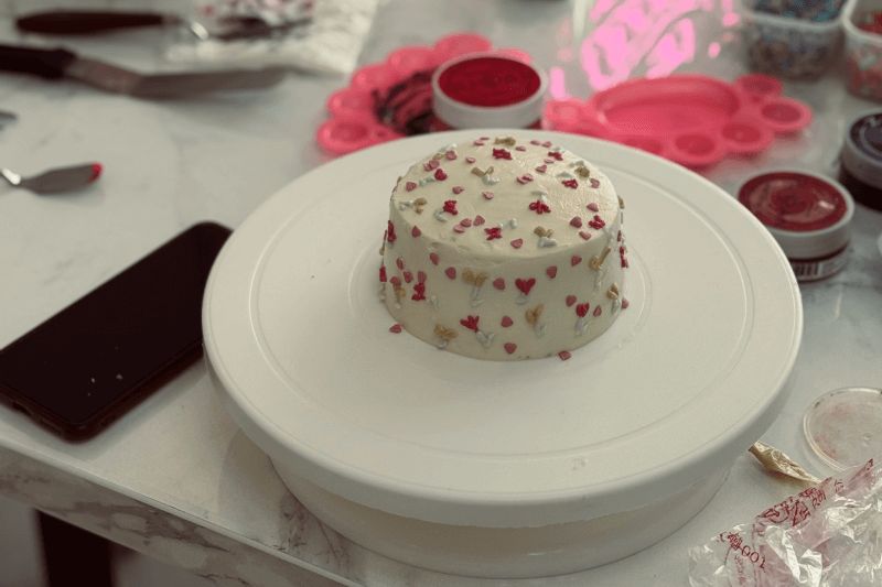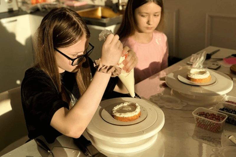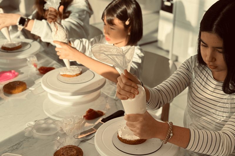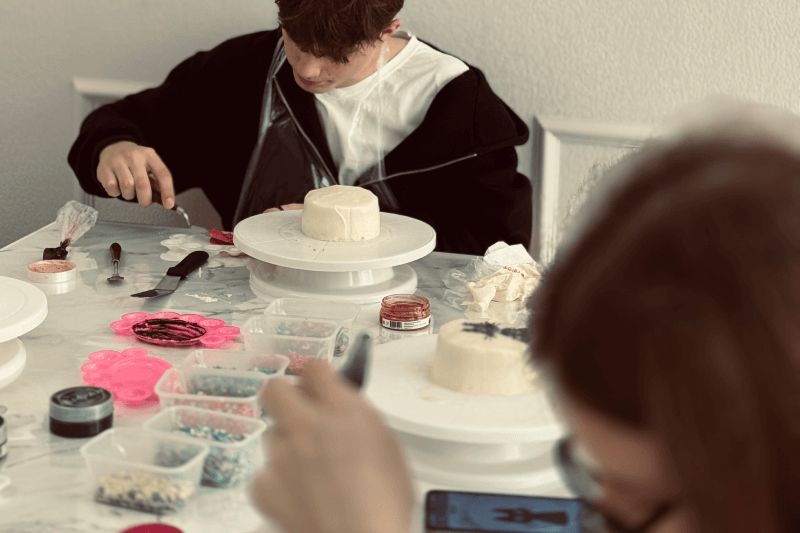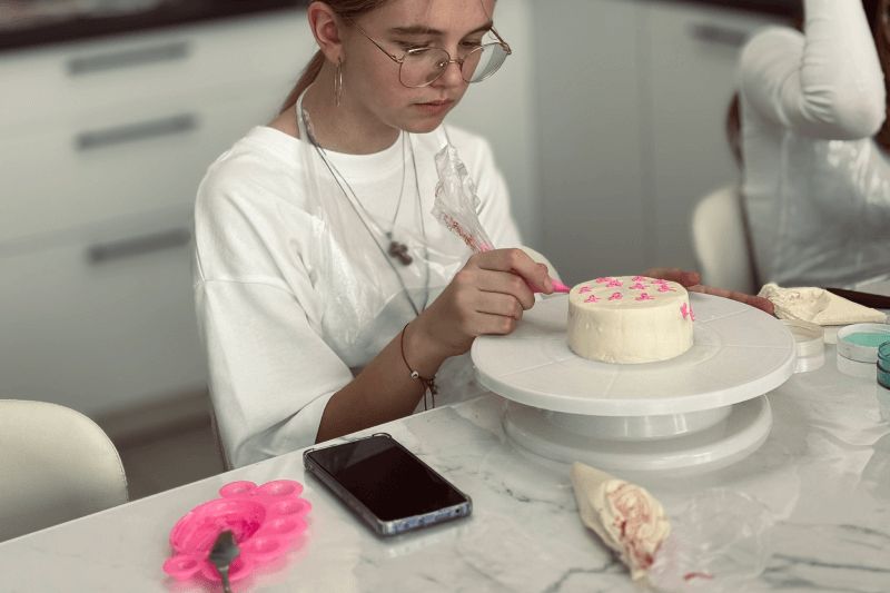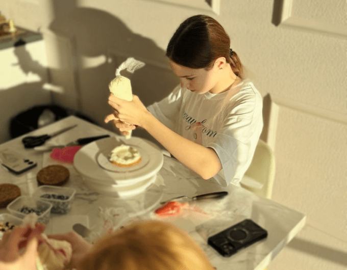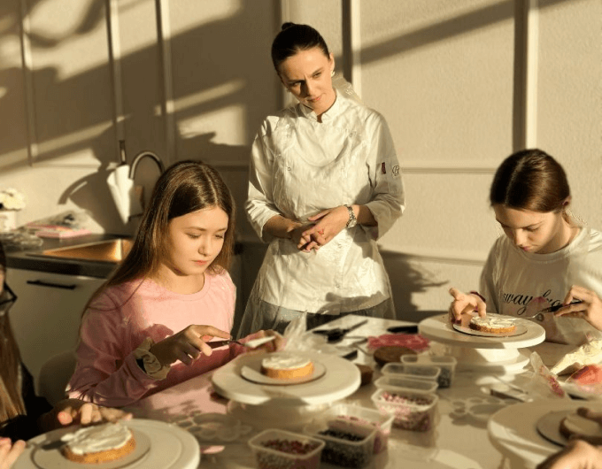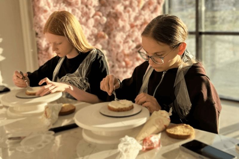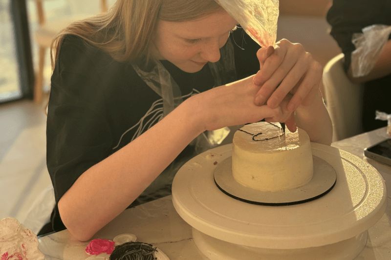 Один из самых важных и творческих этапов. Участники собирают торт слой за слоем, учатся аккуратно работать с формой, чтобы торт выглядел ровно и эстетично, несмотря на небольшой размер. Минималистичные надписи, рисунки, символы, простые, но стильные элементы декора — каждый делает торт под себя. Здесь нет «правильно» или «неправильно», только идея и настроение.-
