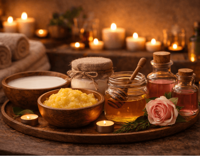 Процедура строится на пяти натуральных компонентах: масле гхи, коровьем молоке, мёде, йогурте и розовой воде. Все ингредиенты имеют природное происхождение и используются в аюрведе веками как источники питания, очищения и омоложения. В составе средств нет нефтепродуктов, силиконов, агрессивной химии и искусственных красителей. Каждый компонент выбран не случайно — он усиливает действие остальных и работает на глубоком уровне. Это чистая, живая косметика, которая взаимодействует с телом максимально бережно.