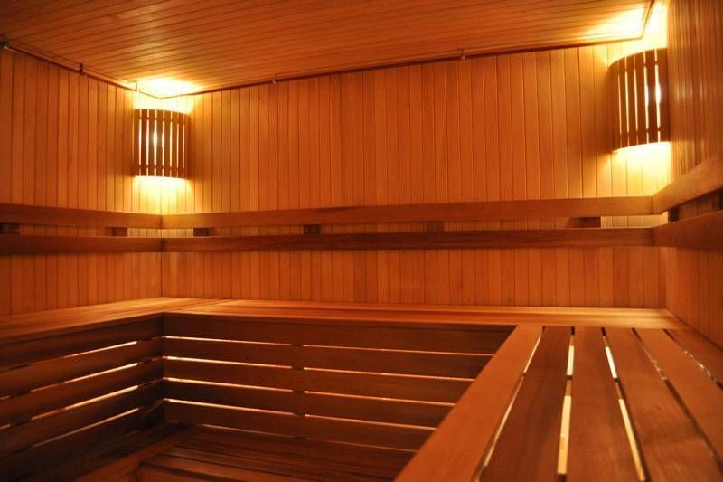 В сауне температура воздуха доходит аж до 95°С, а влажность воздуха — 15%. Здесь есть соляная стена. Которая установлена, чтобы ионы соли могли насыщать воздух комнаты и питать его полезными веществами. Соль очень полезна для кожи и дыхательных путей.-