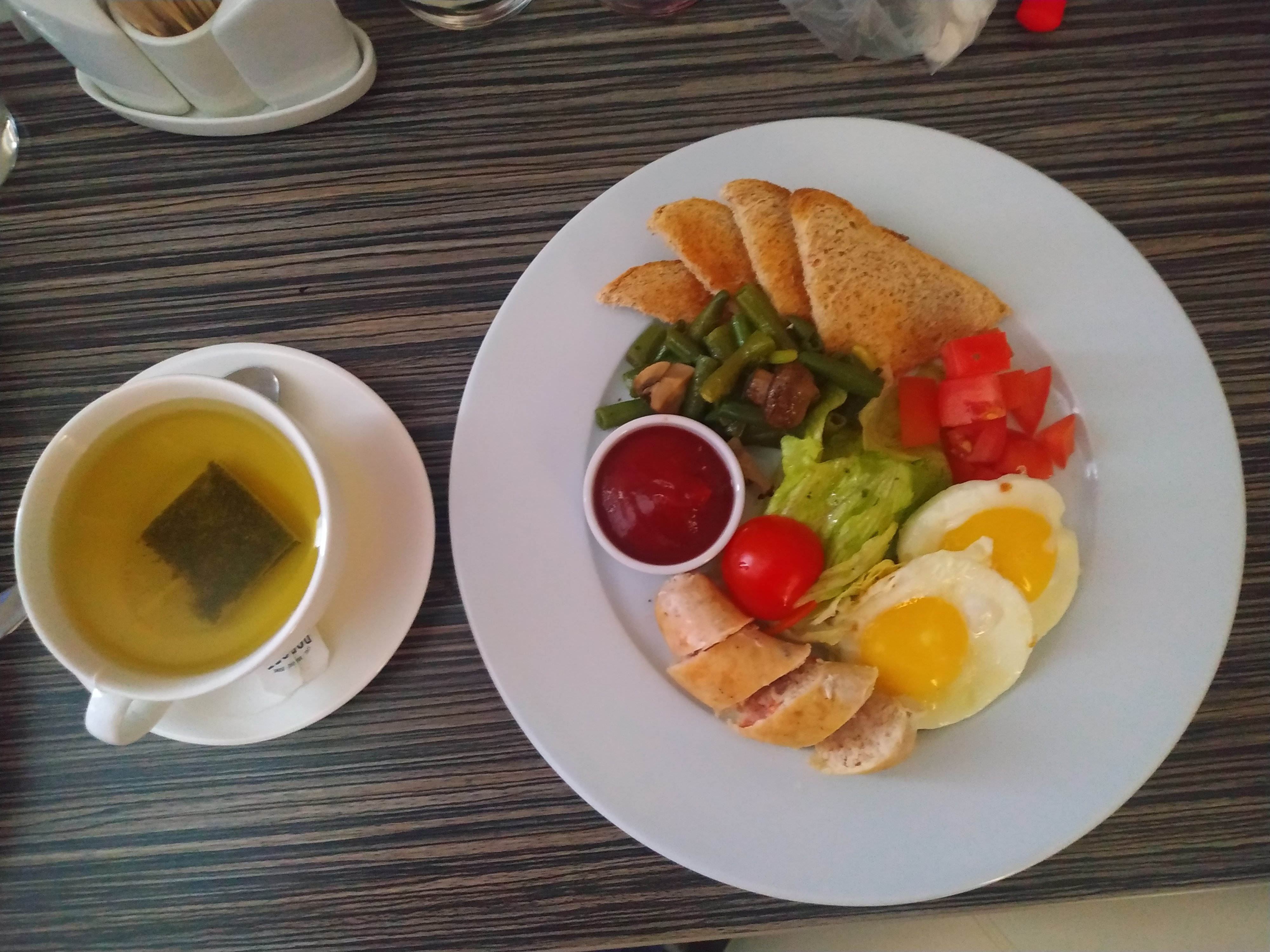 - Традиционный английский завтрак (350 г) - яйца, колбаска куриная, грибы шампиньоны, помидор, фасоль стручковая, микс салатов, помидор черри, красный песта, хлеб тостовый.