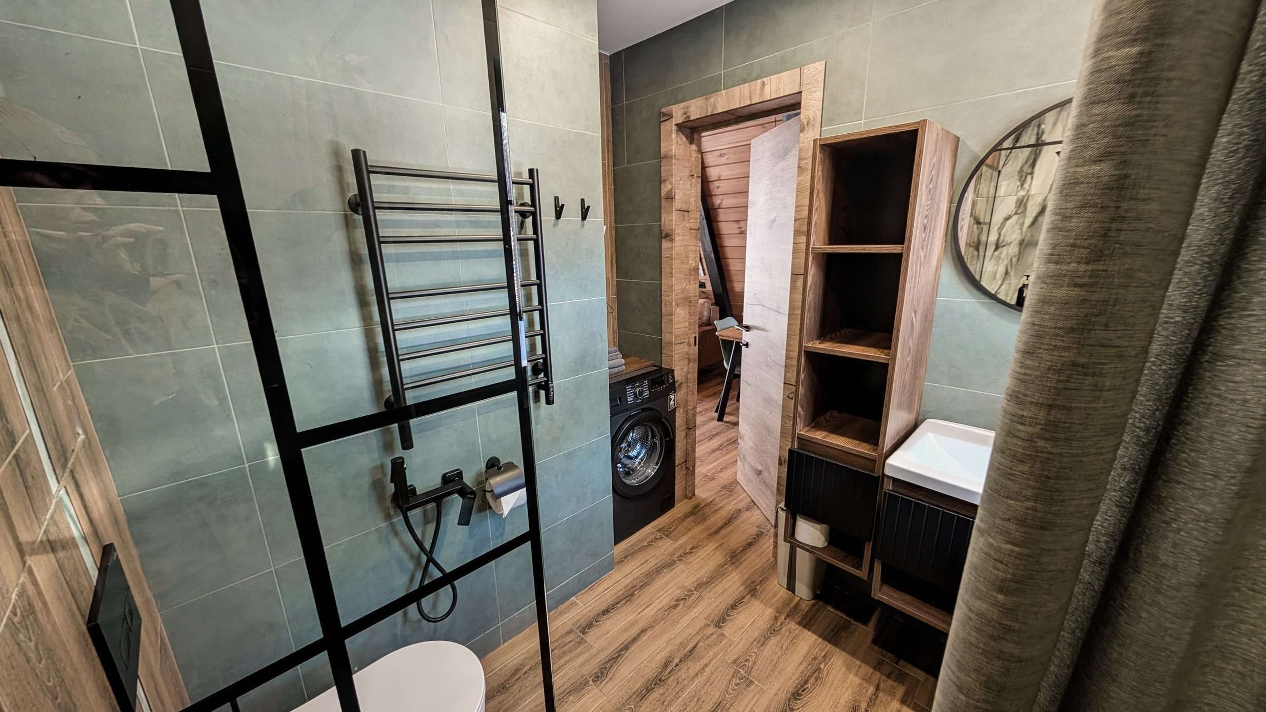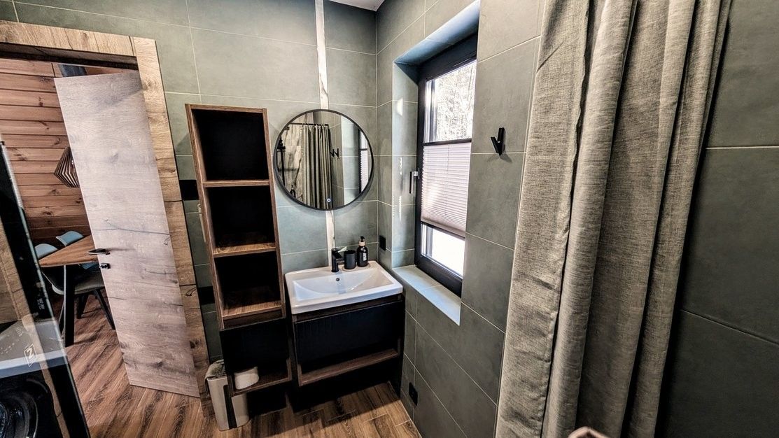 В домике есть все необходимое для комфортного проживания и отдыха, 2 двуспальные кровати (одна из них king size), комфортный диван-кровать, белье, полотенца, теплые полы, СВЧ-печь, чайник, кофемашина, плита, чай, кофе, мангал, решётка для барбекю, просторная терраса со столовой мебелью, комплект посуды для 6 человек, вся необходимая посуда для приготовления, ТВ-зона, доступ к Wi-fi.
